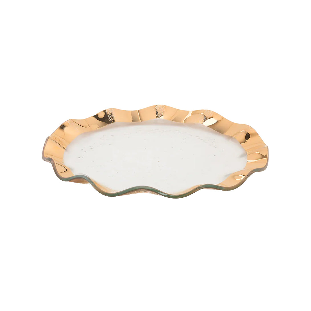 The beloved Ruffle Buffet Plate, with its clear glass base and ruffled edges in either 24k gold, matches with any patterned plate for a contemporary spin on the classic china table setting. Sized to stack with the Ruffle Dinner Plate and Ruffle Salad Plate for a complete glass dinnerware set. It is large enough to be used as a server.