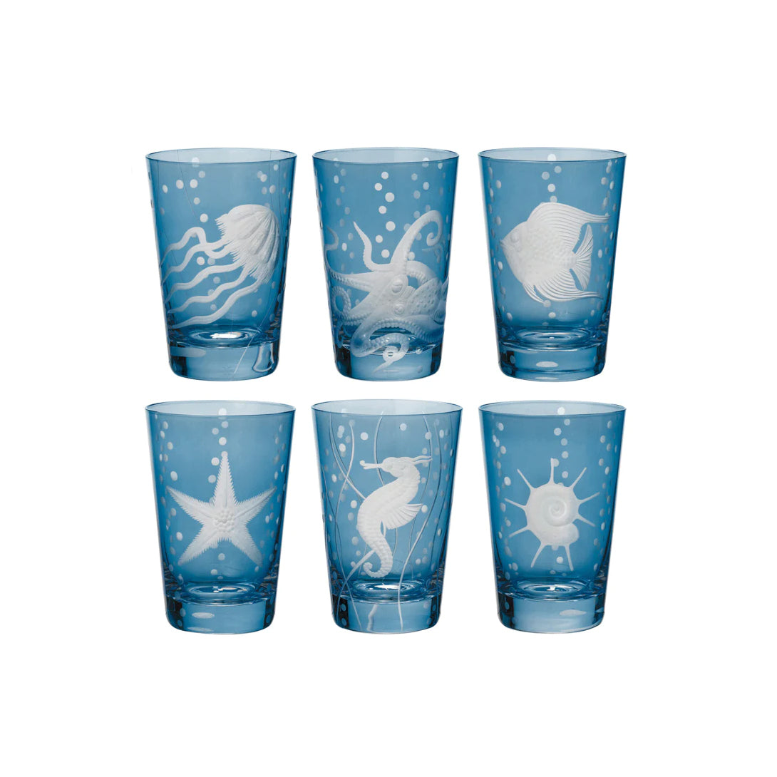 Elevate your table with Artěl’s Sea Life Collection, featuring six hand-blown tumblers, each etched with a unique sea creature motif. Perfect for water, juice, or cocktails, these versatile glasses add a touch of ocean-inspired elegance to any occasion.