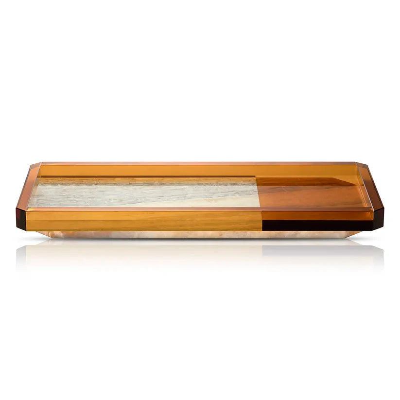 The Shadow Tray artfully combines caramel accents with translucent crystal, framed by hexagonal edges. This elegant piece captures twilight’s serenity, perfect for serving drinks or as a sophisticated décor element for your office. Embrace dusk’s allure with a touch of playful refinement.