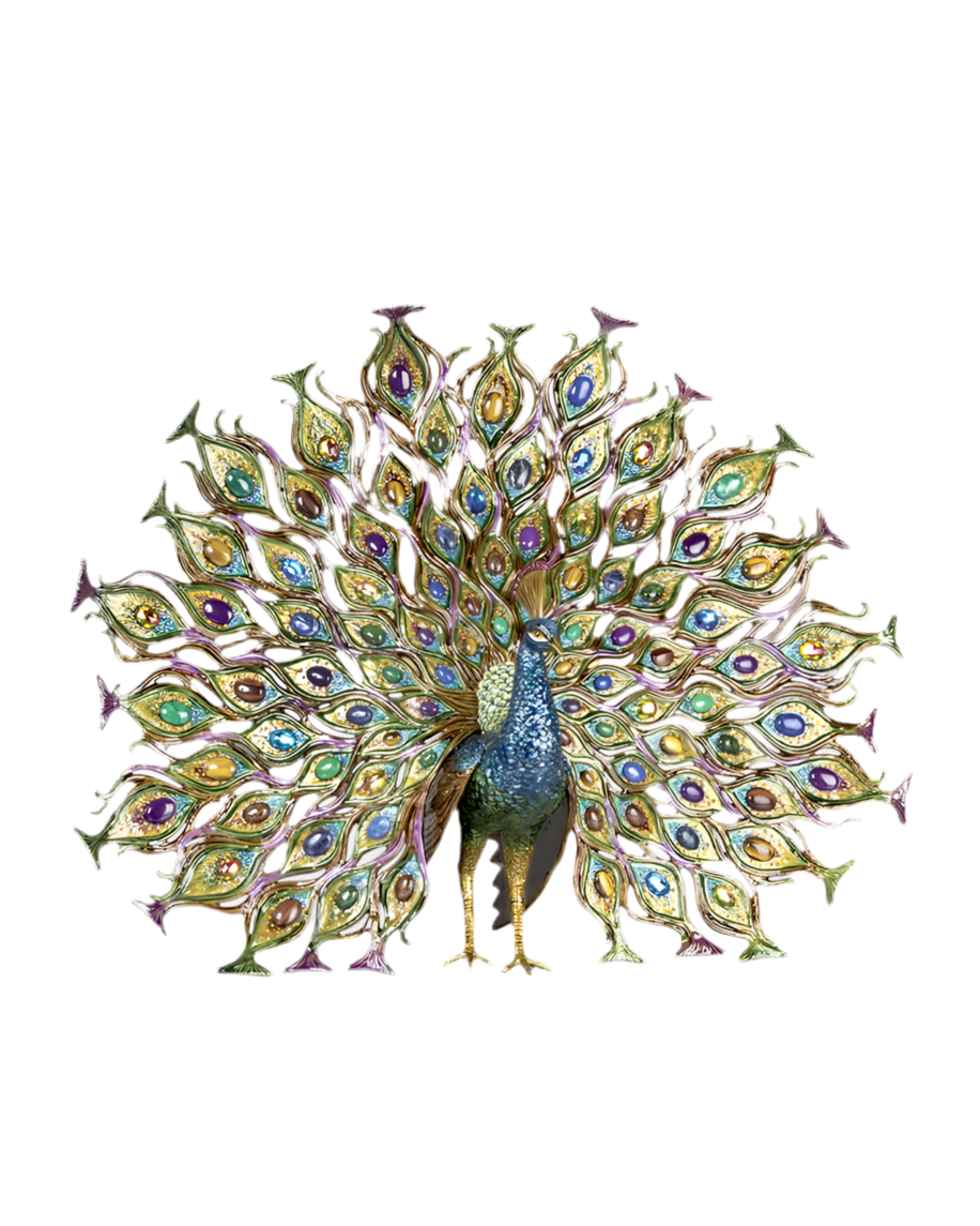 Extraordinary. Fifty semiprecious cabochons, surrounded by more than 4,500 crystals, set the Stanton Fan Tail Peacock Figurine’s tail ablaze with sparkling color. Carved in metal with delicate piercings, the tail spans nearly three feet. His body has been painted in transparent teal, azure, and sapphire-hued enamel, crowned with brilliant fuchsia feathers. The metal for each figurine is first cast in India, and then enameled and stone-set by finest artisans in the Rhode Island workshop.