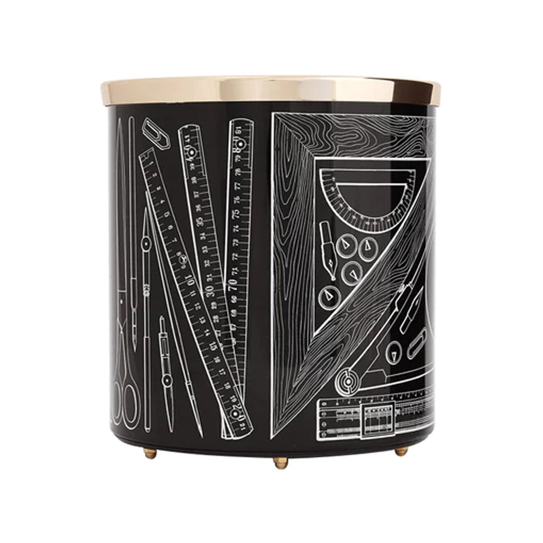 Drawing instruments transformed into the protagonists of decoration lend a touch of Fornasettian irony to this paper holder made of hand-silkscreened and lacquered metal, with a brass top edge and fitted with feet. Its eclectic shape allows it to be transformed into a container, vase holder, or simple accessory.