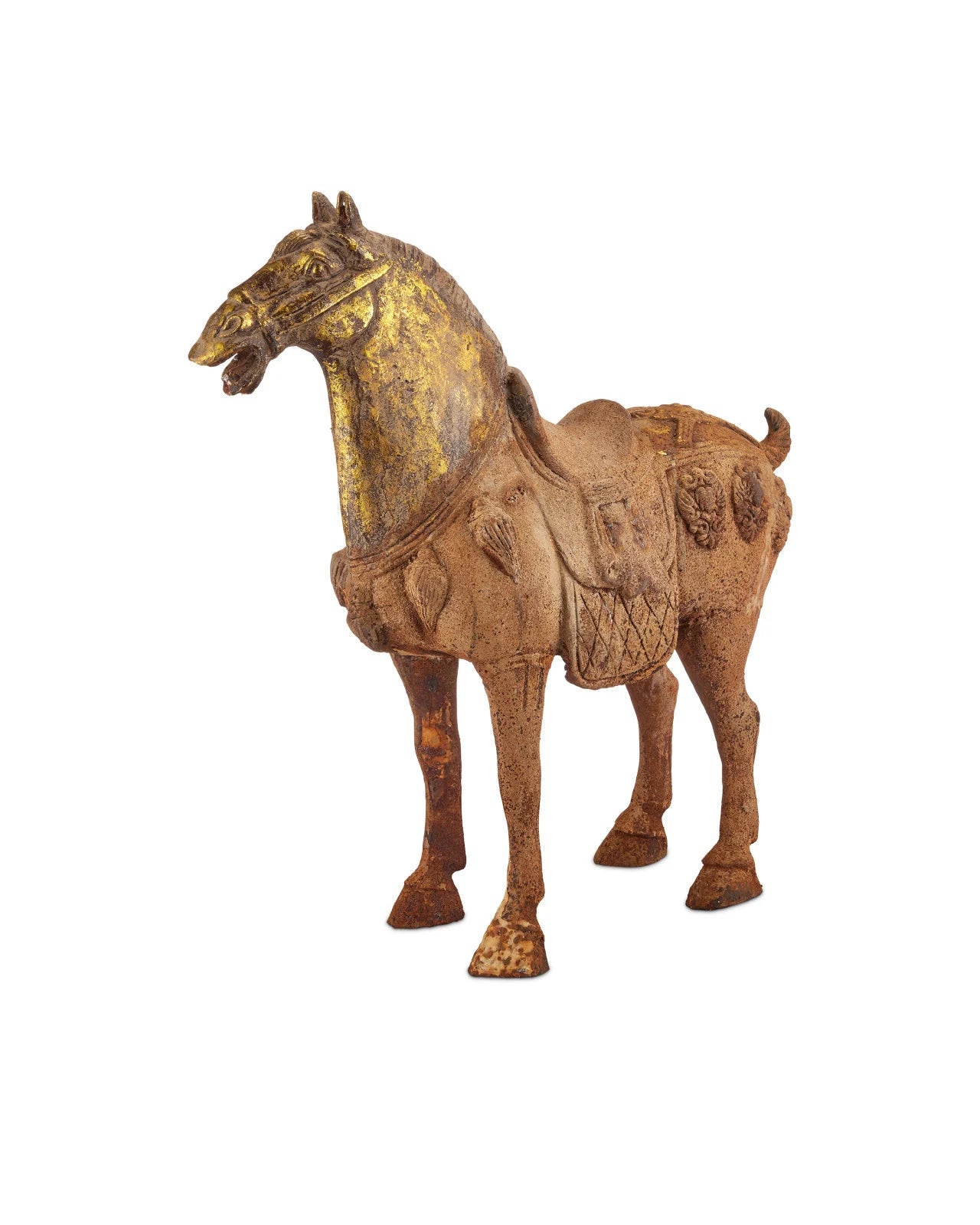 Made of cast iron in a mix of brown and gold finishes, the Tang Dynasty Iron Horse, Right, has incredible patina on its surface to make it look like an authentic antique. This aged-gold sculpture holds so much symbolism that dates back to ancient times. The artisanal aspects of the piece are many, from the hand-applied finishes to the "sculpting" of such a coarse material to make it look poetic.