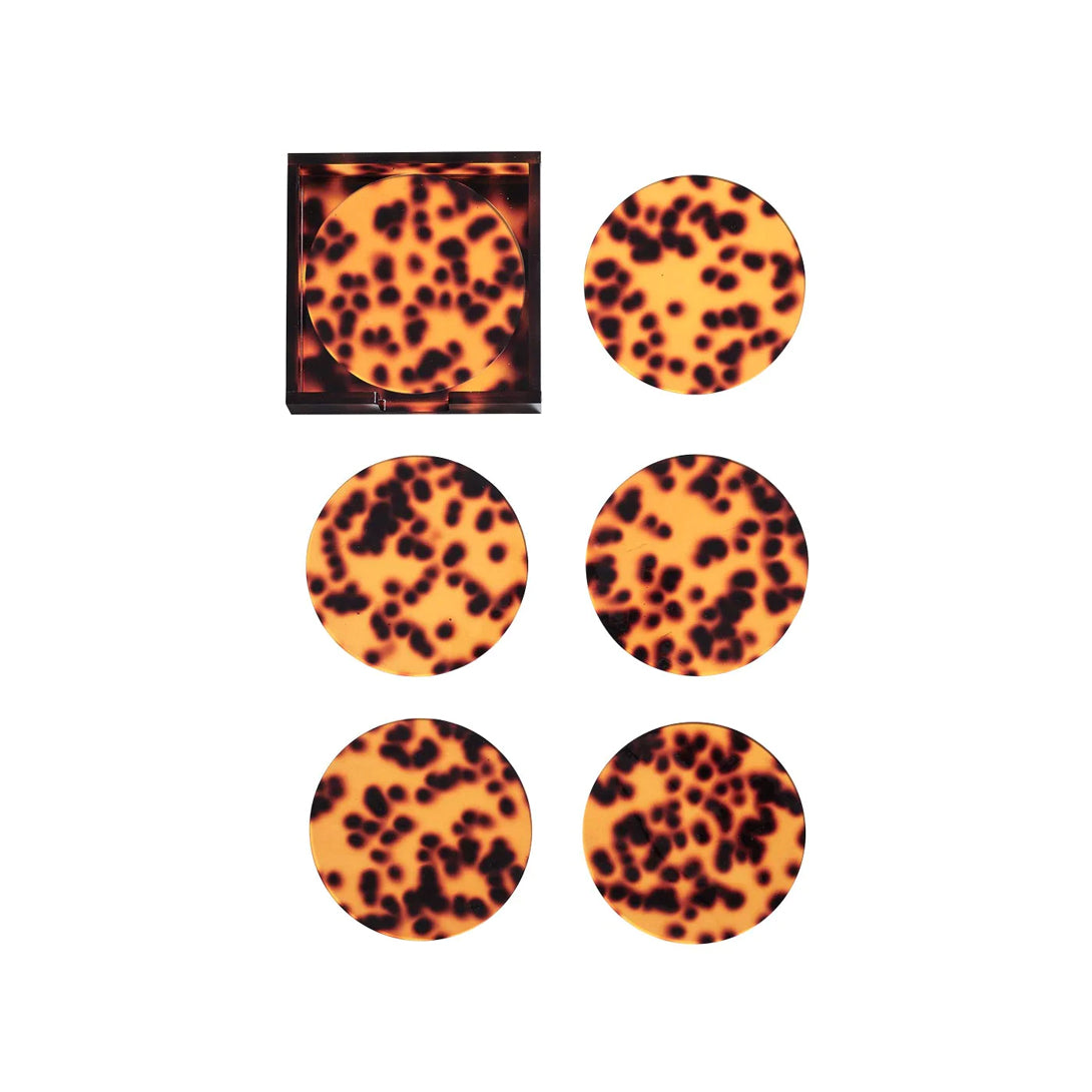 The round, opulent, hand-poured resin Tortoise Drink Coasters are a pristine replica of authentic tortoise shell. The rich, fall hues of the round drink coasters create an elegant setting. Due to the organic nature of the tortoise pattern, these drink coasters may vary from one to another, a true representation of natural tortoise shell.