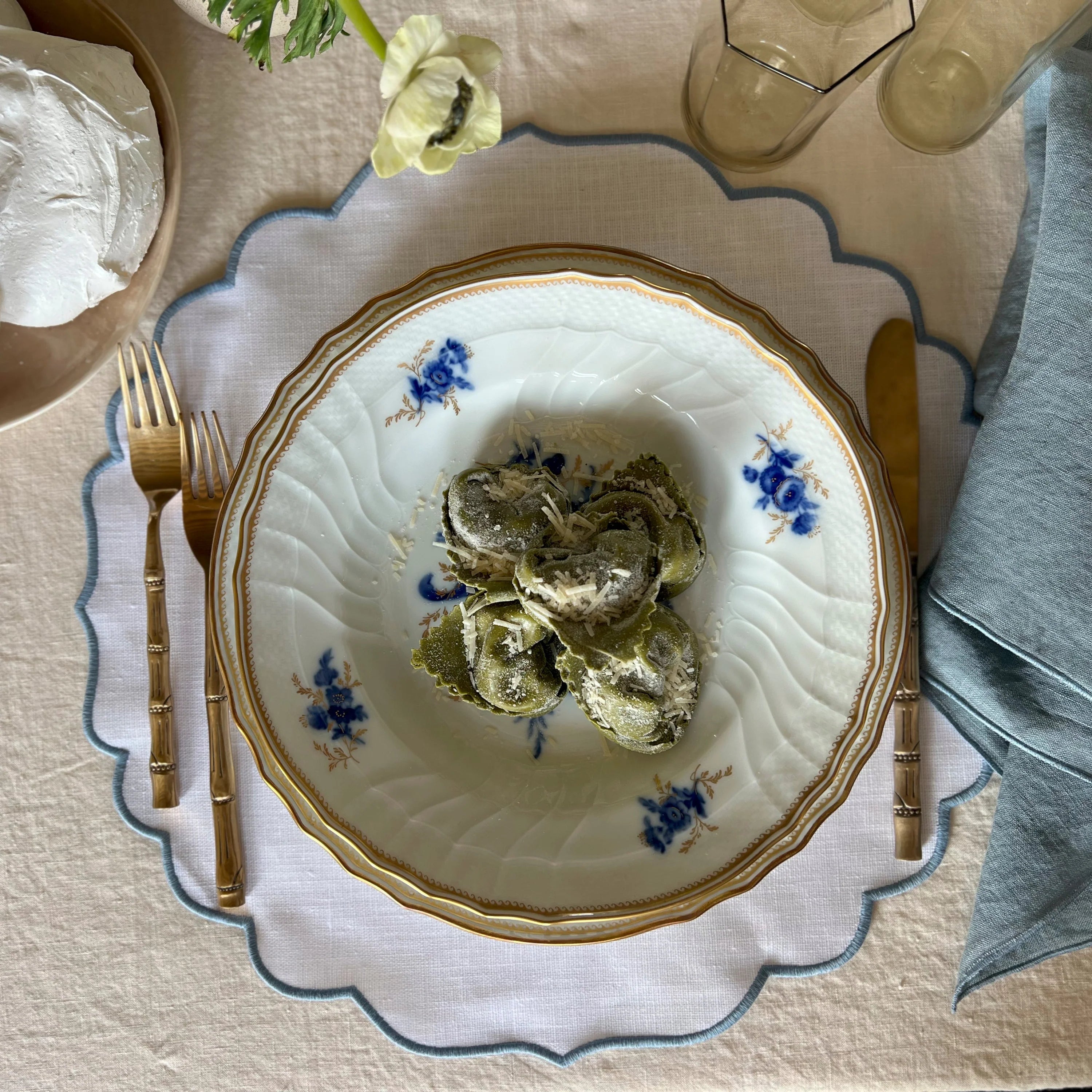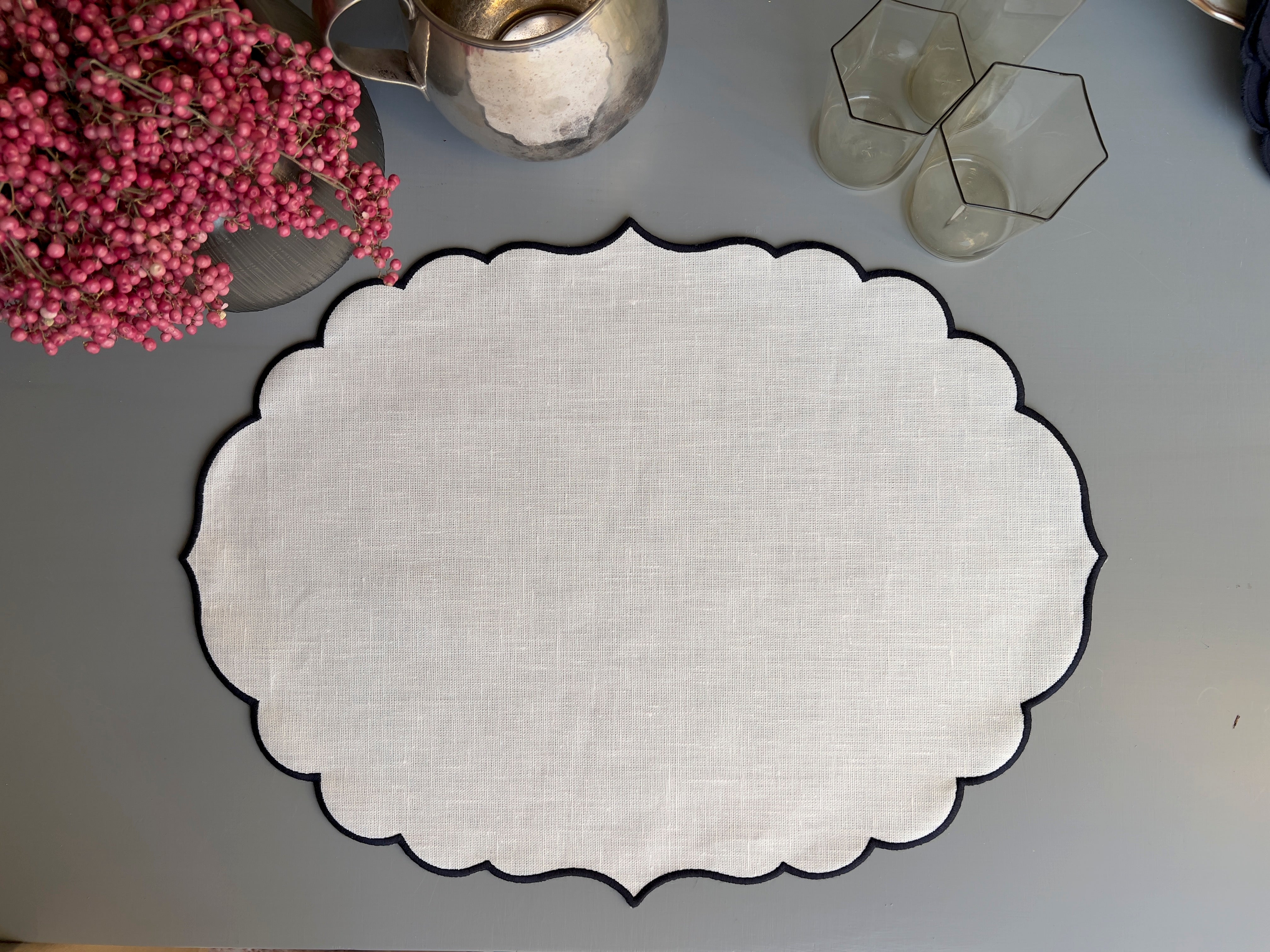 Crafted from waxed linen, these beautiful placemats are both elegant and practical. The scalloped detailing in contrasting colors give a dash of color for your table.