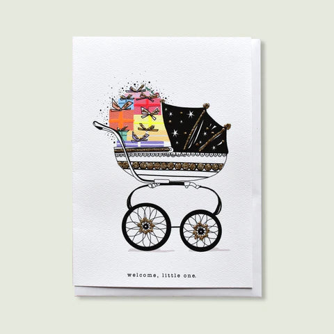 Featuring stunning original artwork, carefully enhanced by hand with intricate brushstrokes and shimmering gold glitter. The inside is left blank for a personalized message. Complete with a complimentary envelope.